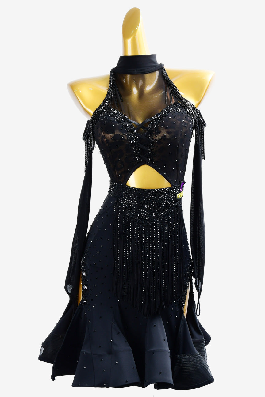 Permino black Latin dress with fringe,crystal AB and beaded fringe